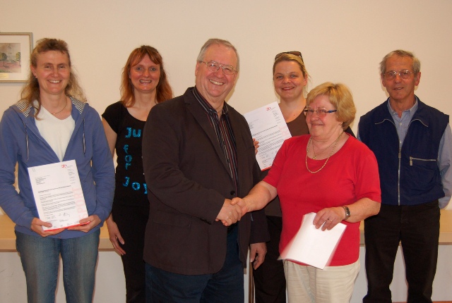 Der Sportkreisvorsitzende Manfred Schmidt (3.v.l.) überreichte die Förderbescheide an (v.l.) Karina Kolb (TTG Oberseelbach), Manuela Naumann (SKG Oberlibbach), Wencke Eißner (TV Rückershausen), Renate Fleischer (SKG Oberlibbach) und Horts Kircher (TV Rückershausen). Foto: MRM