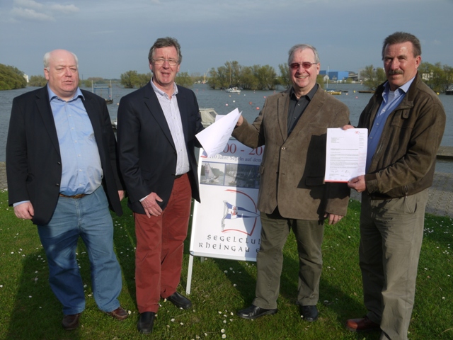 Im Rahmen einer kleinen Feierstunde beim Segelclub Rheingau konnte der Sportkreisvorsitzende des Rheingau-Taunus Manfred Schmidt zwei Förderbescheide an Vereine übergeben. In einer kurzen Ansprache hob er hervor, dass die Vereinsförderung seitens des lsbh nach wie vor einen hohen Rang einnimmt, wenn auch die Auszahlungszeiten auf Grund der Finanzlage länger geworden sind. Aber es gibt nach wie vor keine Kürzungen in gemeinsamen Konsens des lsbh und der Sportkreise. So erhielten der Segelclub Rheingau für die Sanierung der Sportanlage einen Zuschuss von € 5.070,00 und der Luftsportclub Rheingau für seine Baumaßnahme einen Zuschuss von € 3.307,00. Die beiden Vorsitzenden dankten dem Sportkreisvorsitzenden. Dieser dankte Herrn Gottschalk für seine Gastfreundschaft. Anschließend fachsimpelte man bei einem kleinen Imbiss über aktuelle Themen des Sports.