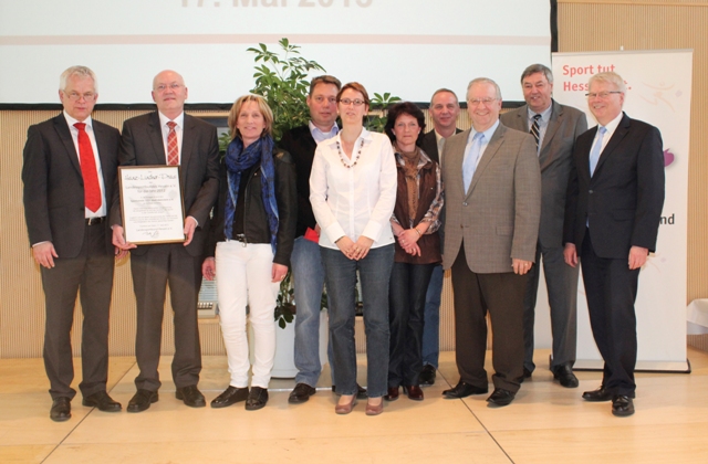 Bildquelle: LsbH Ralf Wächter. v.l. Ralf-Rainer Klatt Vizepräsident des LsbH, Rolf Lehmann 1. Vorsitzender SV Wallrabenstein mit weiteren Vertretern des Vereins, v.r. Staatssekretär im Innenministerium Werner Koch, Dr. Rolf Müller Präsident des LsbH, Manfred Schmidt 1. Vorsitzender Sportkreis Rheingau-Taunus