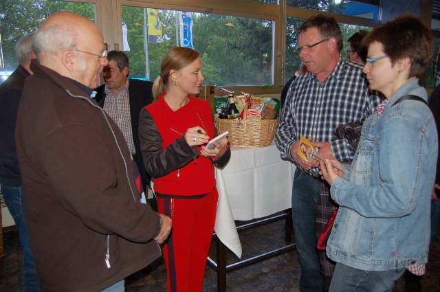 Der Sportkreisvorsitzende und seine Stellvertreterin Uschi Ferry überreichten Regina Halmich und Werner Schaefer als Dankeschön für den kurzweiligen und interessanten Abend Präsentkörbe, die Rewe zur Verfügung gestellt hatte. Im Anschluss stand die Referentin den Zuhörern für Fragen und Autogrammwünsche zur Verfügung.