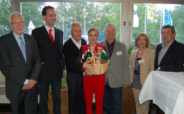 Gruppenbild mit Präsent (v.l.): Idsteins BM Gerhard Krum, Thorsten Vogl (Rewe), Gastgeber Ernst Schmitz, Regina Halmich, Sportkreisvorsitzender Manfred Schmidt, seine Stellvertreterin Uschi Ferry und Moderator Werner Schaefer. Foto: MRM