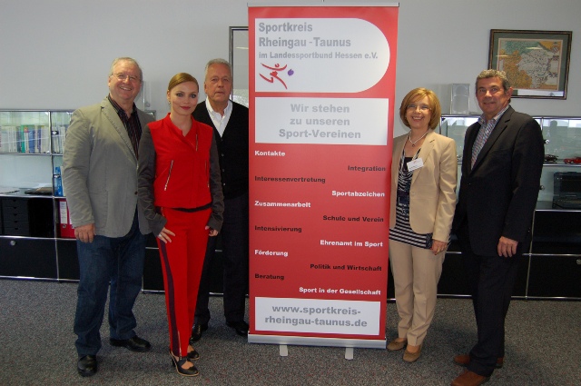 Der Sportkreisvorsitzende Manfred Schmidt (l.), seine Stellvertreterin Uschi Ferry (2.v.r.) und Gastgeber Ernst Schmitz (3.v.l.) begrüßten Boxkönigin Regina Halmich (2.v.l.) und Moderator Werner Schaefer (r.) in Idstein. Foto: MRM
