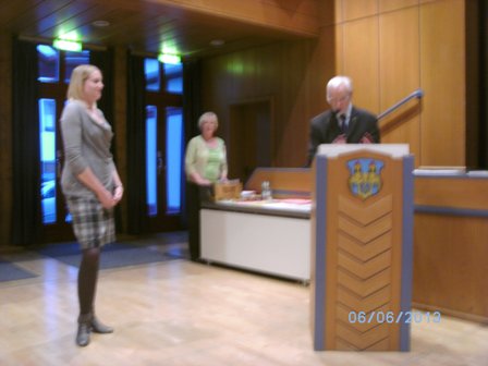 Idstein, 7.6.2013. Am 7.6.2013 fand die Sportlehrehrung der Stadt Idstein in der Stadthalle Idstein statt. Nach der Ehrung der Jugendlichen um 18.00 Uhr bei der unsere Jugendwartin Laura Schütz den Sportkreis vertrat, folgten ab 20.00 Uhr die Ehrungen der Erwachsenen. Nach den Grußworten von Hr. Bürgermeister Gerhard Krum, dem Stadtverordnetenvorsteher Hr. Christian Herfurth und dem Vorsitzenden des Sportkreises Hr. Manfred Schmidt folgten die Ehrungen erfolgreicher Sportler und verdienter Mitglieder Idsteiner Vereine. Die Geehrten stammen u.a. aus folgenden Vereinen: TSG Wörsdorf, Schützenverein Falke Dasbach 1962 e.V., 1. UTK Bogensportclub Oberauroff, DLRG Idstein, TV 1844 Idstein, AMC Idstein, Karate Dojo Idstein und dem Schachclub Turm Idstein. Aufgelockert wurde die Veranstaltung von sportlichen Vorführungen des Karate Dojo Idstein und den Röhnradturnerinnen/-artistinnen des TSV Bleidenstadt sowie durch einen Showtanz der Showdancegruppe "EleXier" des TSG Wörsdorf. Zum Schluß des Abends folgte noch die Auszeichnung zur Sportlerin des Jahres 2012 und die Verleihung der Silbernen und Goldenen Sportplakette der Stadt Idstein. Insgesamt eine gelungene Veranstaltung, die die Leistung der Sportler und Ehrenamtlichen würdigte.