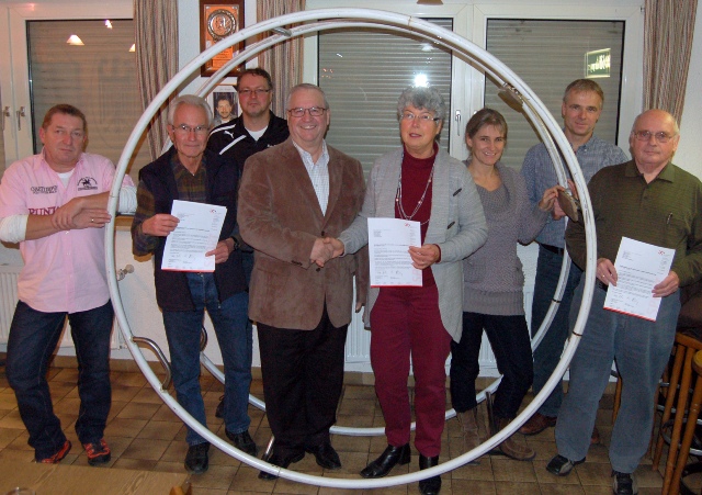 Eingerahmt von einem durch die Fördermittel angeschafften Rhönrad überreichte der Sportkreisvorsitzende Manfred Schmidt (4.v.l.) die Förderbescheide an (v.l.) Gerold Klapper (TV Bermbach), Gerhard Schmidt, Torsten Stolz (beide Thalschütz Hausen), Sigrid Kleffmann-Meyer, Dr. Jutta Nothoff, Jürgen Bientzle (alle SVN) und Heinz Crönlein (TV Bermbach). Foto: MRM