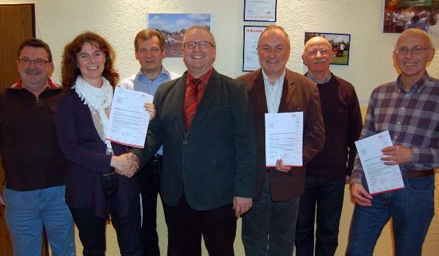 Der Sportkreisvorsitzende Manfred Schmidt (Mitte) überreichte die Förderbescheide an (v.l.) Gerhard Schröck, Tanja Waterwiese (beide TuS Kemel), Karl-Heinz Laufer (FC Gladbach), Gerhard Rüppel (TSV Bleidenstadt), Hans Joachim Krauß und Klaus Erntner (beide TG Oberjosbach). Foto: MRM