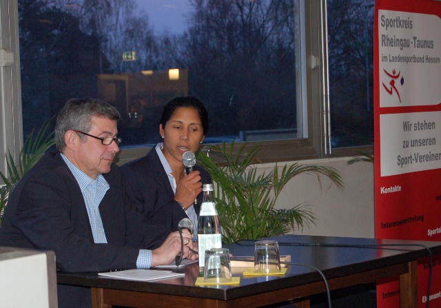 Idstein – (MRM) Einen weiteren Glanzpunkt setzte der Sportkreis Rheingau-Taunus mit der ehemaligen Fußballnationalspielerin und heutigen DFB-Direktorin Steffi Jones im Rahmen seiner hochkarätigen Vortragsreihe. Ihr Thema lautete „Steffi Jones – Ihr Leben und Wirken in einer Männerdomäne.“ Die mehr als 200 Zuhörer im Casino der Firma Ernst Schmitz Logistics in Idstein erlebten einen kurzweiligen und informativen Vortragsabend.