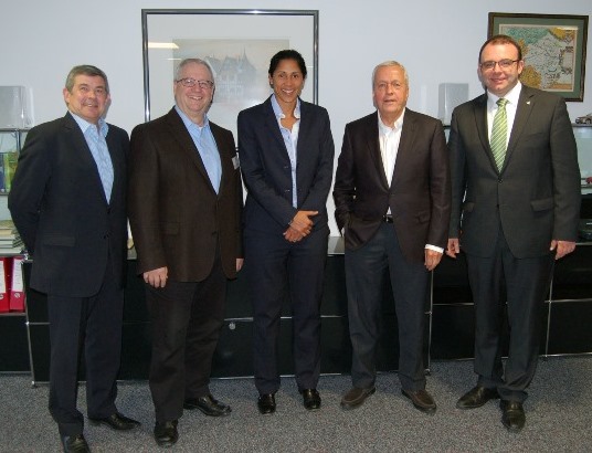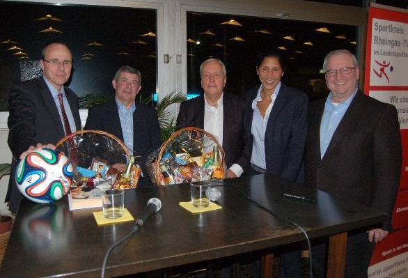 Gruppenbild mit Dame (v.l.): Moderator Werner Schaefer, Sportkreisvorsitzender Manfred Schmidt, Referentin Steffi Jones, Gastgeber Ernst Schmitz und Idstein Bürgermeister Christian Herfurth. Foto: MRM