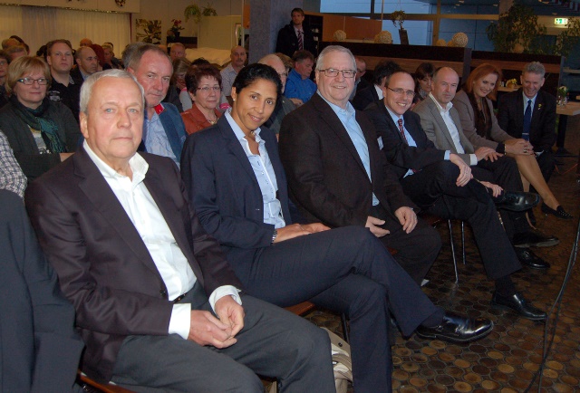 Das Casino der Firma Ernst Schmitz war bis auf den letzten Platz besetzt. In der vorderen Reihe (v.l.): Gastgeber Ernst Schmitz, Referentin Steffi Jones, der Sportkreisvorsitzende Manfred Schmidt und Staatsminister Peter Beuth. Foto: MRM