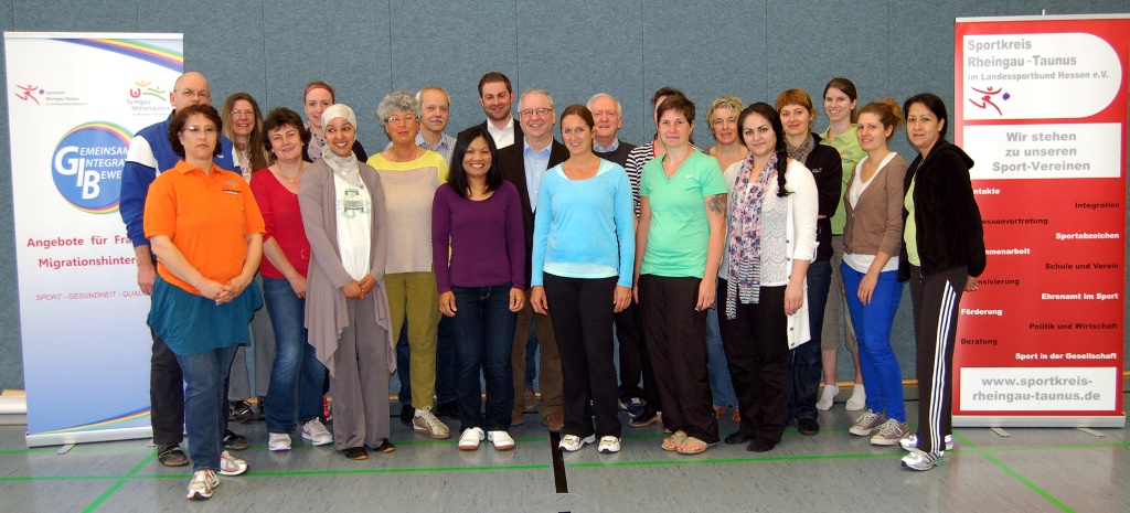 Rheingau-Taunus-Kreis/Taunusstein – (MRM) Am Wochenende fiel in der Aartalhalle in Taunusstein-Neuhof der Startschuss für 12 Frauen mit und ohne Migrationshintergrund aus dem gesamten Kreis, die eine Ausbildung zu Übungsleiterinnen absolvieren. Diese vom Sportkreis Rheingau-Taunus in Zusammenarbeit mit dem Turngau Mitteltaunus im Rahmen des Projektes „Gemeinsam Integration bewegen“ (GIB) angebotene interkulturelle Ausbildung umfasst ca. 140 Stunden. Bis zu den Sommerferien wird die Ausbildung abgeschlossen sein, sodass die Teilnehmerinnen nach bestandener Prüfung die Übungsleiter-Lizenz C für Breitensport (Erwachsene / Ältere und Kinderturnen) erhalten.