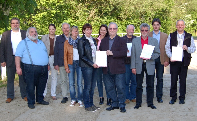 Der Sportkreisvorsitzende Manfred Schmidt (vorne Mitte) und sein Vorstandkollege Michael Hoyer (l.) überreichten in Idstein die Bescheide an (v.l.): Peter Langner, Andrea Sebbesse (beide TuS Königshofen), Ottmar Eger, Kerstin Hering, Heidrun Eger, Andrea Kaczmarek (alle RuF Idstein), Hartmut Hörning (SG Kröftel), Helmut Pfuhl (TV Niederseelbach), Ralf Sebald und Peter Krux (beide 1. PBC Idstein). Foto: MRM