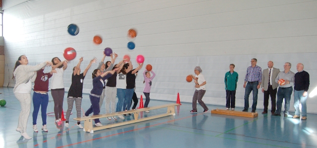 Übungsleiterin Sibel Atlan (6.v.r.) hat beim TV Michelbach eine neue Sportgruppe aufgebaut. Dass die Mädchen im Alter von 10 bis 15 Jahren mit viel Spaß bei der Sache sind, davon überzeugten sich vor Ort (v.l.n.r.) Abteilungsleiterin Erika Platner, der TVM-Vorsitzende Armin Plohmann, Bürgermeister Udo Scheliga, der Sportkreisvorsitzende Manfred Schmidt und der Turngau-Vorsitzende Rolf Byron. Foto: MRM