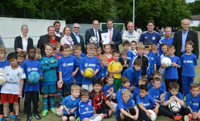Mitte mit Ball Peter Beuth Innenminister und für Sport, links davon Manfred Schmidt, rechts Sando Zehner Bürgermeister Taunusstein, Gerhard Rüppel 1. Vorsitzender TSV Bleidenstadt, rechts außen Karl-Heinz Kramer Sportdezernent Stadt Taunusstein. Foto: Hess. Ministerium des Inneren und für Sport