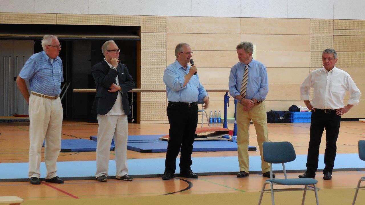 v.l. Horst Breßler 1. Vorsitzender TV Oberwalluf, Jochen Baumgarten 1. Vorsitzender Turngau Süd-Nassau, Manfred Schmidt Vorsitzender Sportkreis Rheingau-Taunus, Heinz Balsulland Beigeordneter der Stadt Walluf, Hubert Rahn Sportdezernent Eltville. Foto: TV Oberwalluf