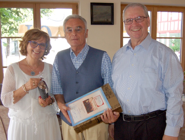 Der Sportkreisvorsitzende Manfred Schmidt .r.) und seine Stellvertreterin Uschi Ferry (l.) gratulierten dem Ehrenvorsitzenden Jürgen Gerndt und überbrachten ihm ein Präsent sowie die Glückwünsche des gesamten Sportkreis-Vorstandes. Foto: MRM
