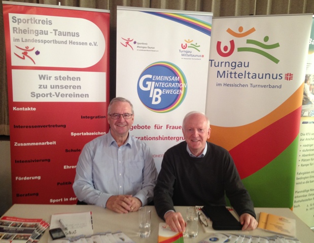 Beim Aktionstag Bürgerschaftliches Engagement2014 im Bürgerhaus Taunusstein-Hahn war auch der Sportkreis Rheingau-Taunus und der Turngau Mitteltaunus mit einem Stand vertreten. Die beiden Vorsitzenden Manfred Schmidt und Rolf Byron standen den Besuchern zu Fragen rund um das Ehrenamtliche Engagement zur Verfügung und stellten das gemeinsame Projekt GIB, Gemeinsam Integration Bewegen, vor. Text: Michael Hoyer
