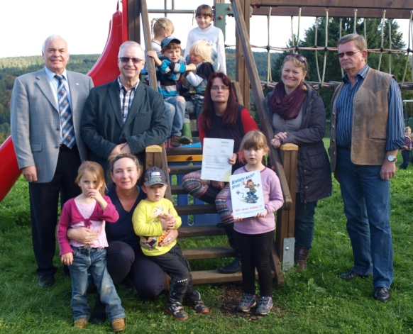 Nachdem Manfred Schmidt sich überzeugen konnte, dass alle Kriterien erfüllt werden, überreichte er im Beisein von Ortsvorsteher Patzelt und Herrn Conradi von der Gemeindevertretung Hohenstein an die Leiterin Frau Buchholz und ihre Mitarbeiterin Frau Hildebrand einen Gutschein zum Erwerb von sportlichen Kleingeräten sowie das Zertifikatsschild des Projektes. Text: Christina Fuchs