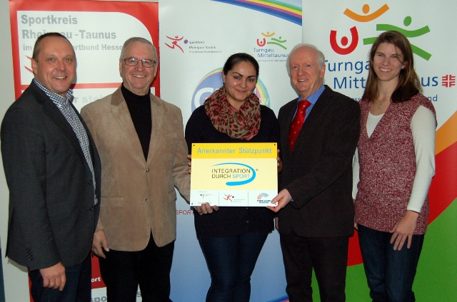 Rheingau-Taunus-Kreis – (MRM) Der Sportkreis Rheingau-Taunus und der Turngau Mitteltaunus wurden kürzlich von der Sportjugend Hessen mit der Plakette „Anerkannter Stützpunkt – Integration durch Sport“ ausgezeichnet. Mit dieser Auszeichnung wird das unermüdliche Wirken der beiden Sport-Organisationen in Sachen Integration/Ausbildung von Übungsleiterinnen mit Migrationshintergrund gewürdigt. Die Auszeichnung wurde von dem Sportkreisvorsitzenden Manfred Schmidt, dem Turngauvorsitzenden Rolf Byron und Meral Qajrauoui (Mitarbeiterin Integration im Sportkreis) aus den Händen von Frank Eser dem Vertreter der Sportjugend Hessen in Idstein entgegen genommen.