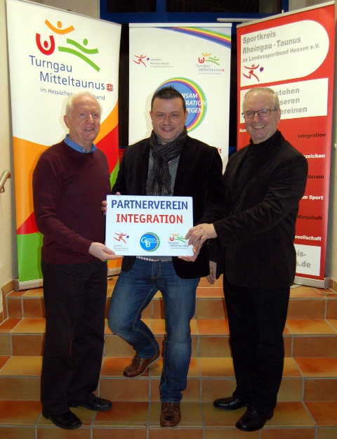 Die Verantwortlichen des Projektes „GIB“ – der Sportkreisvorsitzende Manfred Schmidt und der Turngau-Vorsitzende Rolf Byron – überreichten dem TV Hahn die Auszeichnung als „Partnerverein Integration“. Schmidt und Byron unterstrichen in ihrer kurzen Laudatio, dass man mit dieser Auszeichnung mustergültiges Engagement von Vereinen für das Thema Integration herausstellen und sie darin bestärken wolle, den eingeschlagenen Weg weiterzugehen. „Beim TV Hahn wird Integration gelebt und der interkulturelle Dialog gefördert“, betonte Schmidt. „Sie sind auf dem richtigen Weg!“ „Das Schild soll auch nach außen deutlich machen, wie wichtig dem Sport die Integration ist“, fügte Byron an.