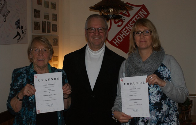 Anlässlich der Weihnachtsfeier des SV Hohenstein konnte der Sportkreisvorsitzende Manfred Schmidt drei Ehrungen im Namen des Landessportbundes vornehmen. In seiner kurzen Laudatio, in der er auf die Leistungen der Geehrten einging und die Wichtigkeit des Ehrenamtes betonte, konnte er an Frau Ingrid Patzelt, Frau Gabriele Geist (war leider kurzfristig verhindert) und Frau Christiane Keil die Verdienstnadeln des Landessportbundes mit den Ehrenurkunden überreichen. Er wünschte den Damen alles Gute und dankte ihnen auch für die Bereitschaft dem Verein auch weiterhin zur Verfügung zu stehen. Text: Michael Hoyer