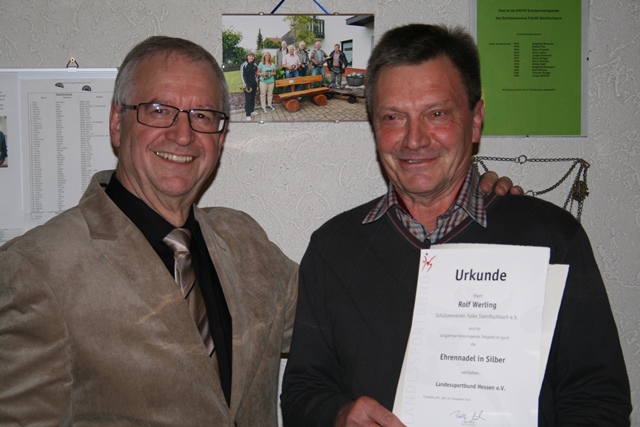 Am 19.12.2014 konnte Manfred Schmidt nach einer kurzen Laudatio zu den Verdiensten, Rolf Wehrling war unter anderem 42 Jahre Vereinsvorsitzender des Falke Steinfischbach, diesem die Silberne Ehrennadel des Landessportbundes mit der Ehrenurkunde in dem feierlichen Rahmen der Weihnachtsfeier, überreichen. Rolf Wehrling wurde am gleichen Abend noch die Ehrenpräsidentschaft des Vereines verliehen. Text: Michael Hoyer