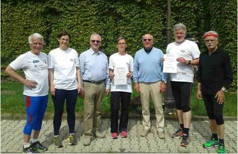 v.l. Helmut Heisen (Sportkreis), Caroline Ehinger (Spaz-Prüferin), Manfred Schmidt, Petra Molle, Walter Fischer, Willi Ruhfass und Hans Salzig (Leiter des Lauftreffs Bad Schwalbach) Foto: Willi Ruhfass