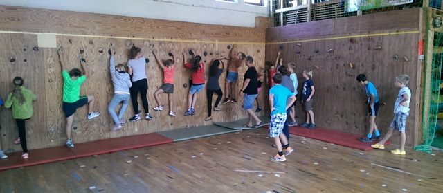 Am Mittwoch stand besonders der Sport im Vordergrund. Bevor es morgens an die Kletterwand ging waren die Kinder im See baden, da die Hitze schon am Morgen dazu einlud. Das Klettern wurde mittels einer Gruppensicherung durchgeführt, die den Teamgeist gestärkt hat und Vertrauen zwischen den Teilnehmern aufgebaut hat.