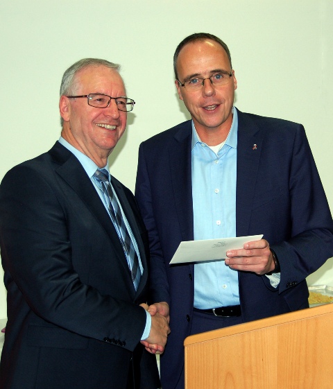 Der hessische Innenminister Peter Beuth überreichte dem Sportkreisvorsitzenden Manfred Schmidt (l.) einen Scheck für die weitere Arbeit des Projektes „GIB“. Foto MRM