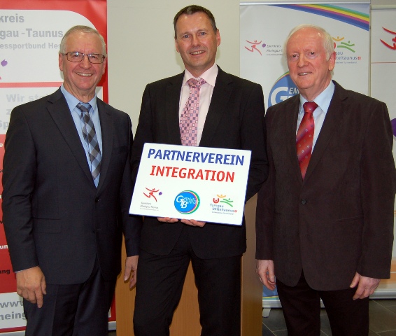 Die Verantwortlichen des Projektes „GIB“ – der Sportkreisvorsitzende Manfred Schmidt und der Turngau-Vorsitzende Rolf Byron – überreichten dem Vorsitzenden des TV Oestrich, Melchior Galla, die Auszeichnung als „Partnerverein Integration“. Schmidt und Byron unterstrichen in ihrer kurzen Laudatio, dass man mit dieser Auszeichnung mustergültiges Engagement von Vereinen für das Thema Integration herausstellen und sie darin bestärken wolle, den eingeschlagenen Weg weiterzugehen. Der TV Oestrich habe mit großen Engagement den gerade abgeschlossenen Übungsleiter-Lehrgang des Projektes „GIB“ unterstützt. „Dies zeigt, dass beim TV Oestrich Integration gelebt und der interkulturelle Dialog gefördert wird“, unterstrich Schmidt. „Das Schild soll auch nach außen deutlich machen, wie wichtig dem Sport das Thema Integration ist“, fügte Byron an.