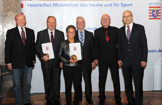 Taunusstein – (MRM) Der Vorsitzende des Sportkreises Rheingau-Taunus, Manfred Schmidt, zeigte sich sehr erfreut darüber, dass zwei ehrenamtlich tätige Vereinsvertreter aus „seinem“ Sportkreis vom Hessischen Minister des Innern und für Sport Peter Beuth anlässlich eines feierlichen Empfangs im Schloss Biebrich mit der Sportplakette des Landes Hessen ausgezeichnet wurden. Die höchste Auszeichnung des Landes im Bereich Sport ging an Hildegund Faber (SV Neuhof) und Gerhard Rüppel (TSV Bleidenstadt), die sich beide seit langen Jahren in ihren Vereinen in vielfältigster Weise ehrenamtlich engagieren.