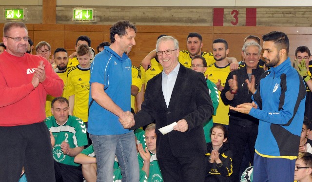 Die Integration von Behinderten in den Fußballsport sei ein Projekt das dem SV Presberg mit den beiden Initiatoren Axel Kaiser und Ali Naghsh überaus gut gelungen ist. Das lobte der Sportkreisvorsitzende Manfred Schmidt der den Verein bei seinem sechsten Hallenfußballturnier für integrative Mannschaften besuchte. Schmidt hatte die beiden Fußballer schon bei der Verleihung "Sterne des Sports" mit Ihrem Projekt "Integrative Fußballturniere" kennengelernt. Der Fokus liegt auch in der Ligagründung für Fußball spielende Behinderte. Der Sportkreis Rheingau-Taunus freut sich über das Projekt der Intergration und Inklusion und übergab als kleine Unterstützung einen Scheck über 150 Euro. Der Sportkreisvorsitzende wünschte weiterhin viel Erfolg und blieb als Zuschauer noch etwas länger, da er vom Enthusiasmus der Spieler so begeistert war. Text: Michael Hoyer