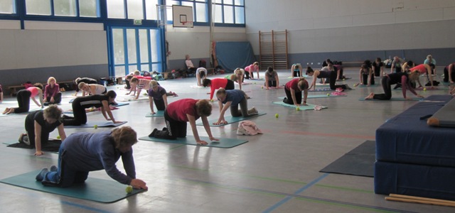 Wieder eine große Anzahl Teilnehmer konnte die Sportwartin Christa Porten vom Sportkreis Rheingau-Taunus in der Halle des Sport- und Jugendzentrum Bleidenstadt begrüßen. Frauen und Männer nehmen an dem Übungsleiterlehrgang zu den Themen Faszien-Fitness sowie Yoga und Pilates teil. Referentin Andrea Flach-Meyerer veranschaulichte zu Beginn an einem Modell die Funktion der Faszien bevor es gleich zu den Übungen geht. In praktischen Beispielen zeigt die Referentin auf wie Faszien beim Training in vielfacher Hinsicht beteiligt werden können um eine größere Beweglichkeit zu erreichen. Wichtig sei bei den Übungen auch die altersgemäße Umsetzung. Übungen können für alle Altersgruppen entsprechend umgesetzt werden. Das Thema Faszien stand bereits im vergangenen Jahr auf dem Programm des Sportkreises. Weil das Interesse nach wie vor groß war hat man sich entschlossen das Thema erneut anzubieten, mit Recht wie die große Anzahl an Teilnehmern zeigt. „Ich bin aber immer wieder erstaunt, dass so wenige Männer an den Fortbildungen teilnehmen." Die nächste Fortbildung des Sportkreises findet am 4. Juni in der Sporthalle des TV Oestrich zum Thema Power-Workout statt. Informationen und Anmeldung bei Sportwartin Christa Porten unter email: otto.porten@online.de. Text: Michael Hoyer