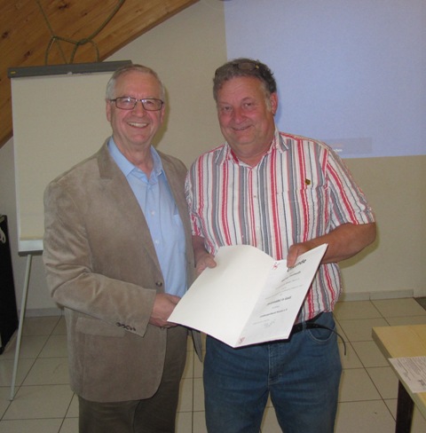 v.l. Sportkreisvorsitzender Manfred Schmidt übergibt Werner Freimuth seine Urkunde. Foto: Heike Zimmer