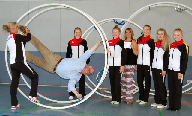 Der Sportkreisvorsitzende Manfred Schmidt (im Rhönrad) überreichte der Vorsitzenden des Fördervereins Christiane Serth (4.v.r.) einen Reisekostenzuschuss und wurde von den für die Weltmeisterschaft qualifizierten Rhönradturnerinnen vor Freude gleich im Rhönrad auf den Kopf gestellt. Foto: MRM
