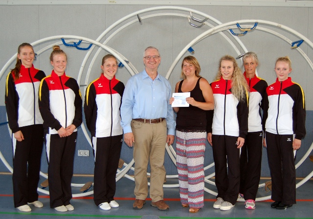 Der Sportkreisvorsitzende Manfred Schmidt (4.v.l.) überreichte im Besein der für die Weltmeisterschaft qualifizierten Rhönradturnerinnen der Vorsitzenden des Fördervereins Christiane Serth (4.v.r.) einen Reisekostenzuschuss. Foto: MRM