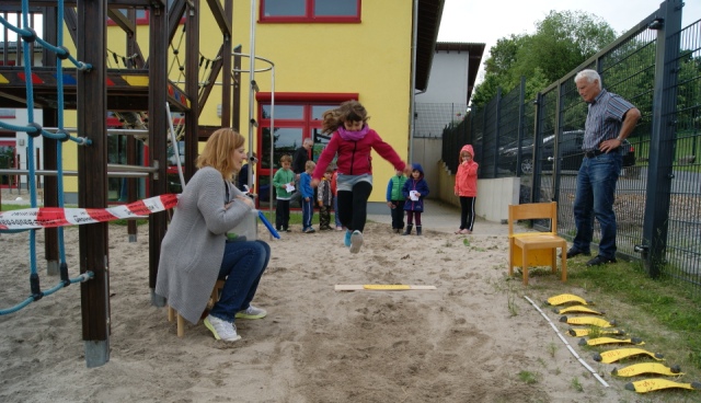 Der Sportkreisvorsitzende des Rheingau-Taunus-Kreises, Manfred Schmidt und der 2. Vorsitzende, Helmut Heisen, besuchten die KiTa RAPPELKISTE in Hohenstein Breithardt zum diesjährigen KiTa- Sportfest. Anlässlich der 3. Anmeldung der KiTa zur Aktion „Bewegen macht Spaß“ freuten sich die Kinder, Erzieherinnen, Leiterin Iris Specht und Frau Walther, Elternvertreterin des Elternbeirates und des Fördervereins der KiTa über die Zuwendung in Höhe von 75.00 € in Form eines Warengutscheines für die Anschaffung von Bewegungsmaterialien. Manfred Schmidt und Helmut Heisen konnten sich auch in diesem Jahr von der Bewegungsfreude und Sportlichkeit der Kinder von 1-6 Jahren überzeugen. Zunächst begrüßte die Kita die Gäste musikalisch, und danach ließen sich Herr Schmidt und Herr Heisen es sich nicht nehmen, sich selbst beim Weitwurf und beim Weitsprung zu üben. Die KiTa RAPPELKISTE wird sich auch in 2018 weiter an der erfolgreichen Aktion des Sportkreises „ Bewegen macht Spaß“ beteiligen. Text: Iris Specht