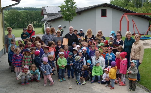 Iris Specht zwischen Manfred Schmidt rechts und Helmut Heisen links und der Kinderschar der KiTa. Foto: Iris Specht