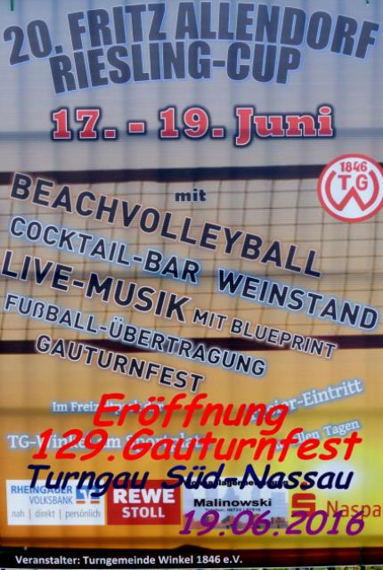Gleich zwei Veranstaltungen fanden auf dem Sport- und Freizeitgelände des TG Winkel statt. Im Sportpark des Vereins starteten von Freitag bis Samstag rund 54 Zweierteams zum 20. Fritz Allendorf Riesling-Cup dem angesagten Beach-Volleyball Event Im Rhein-Main Gebiet. Das 129. Gauturnfest des Turngaues Süd-Nassau, bei dem sich rund 400 Sportler in allen Altersklassen im Geräteturnen und in der Leichtathletik teilnahmen, stand Sonntags auf dem Plan. Sportkreisvorsitzender Manfred Schmidt, der bei beiden Veranstaltungen zu Besuch war, dankte in seinem Grußwort, bei der Eröffnung des Gauturnfest, dem TG Winkel und den vielen ehrenamtlichen Helfer für die tolle Organisation und wünschte allen Aktiven viel Erfolg bei den Wettkämpfen. Mit weit über eintausend Besuchern und Aktiven waren die beiden Veranstaltungen ein voller Erfolg und Werbung für den Sport im Rheingau und den Rheingau-Taunus-Kreis.