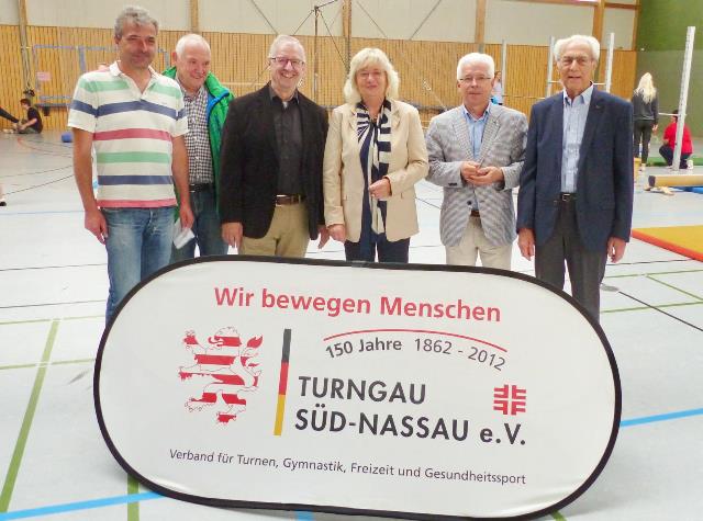 v.l. Frank Weschbach Vorstand TG Winkel, Werner Fladung, 1. Stadtrat Oestrich Winkel, Manfred Schmidt Sportkreisvorsitzender, Petra Müller-Klepper MDL, Roland Laube Stadtverordnetenvorsteher, Günther Stöckert Turngau Süd Nassau. Foto: Hermann Martin