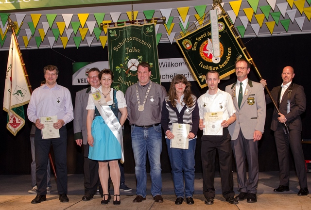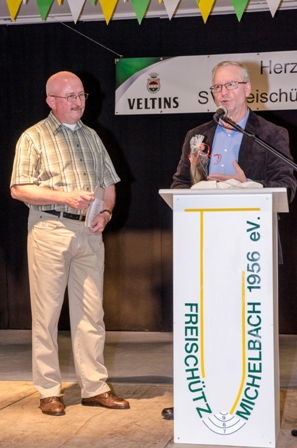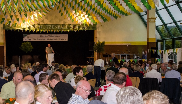 In seiner kurzen Laudatio sagte Schmidt unter anderem „ …, das Schützenwesen hat ja seit Jahrhunderten eine große Tradition. Was ist daran so faszinierend? Es erschöpft sich nicht im Festhalten von äußeren Zeichen. Die Schützenvereine haben sich frühzeitig in Vereinigungen zusammengeschlossen, in denen neben dem Schießsport auch die Geselligkeit gepflegt wird und einen großen Stellenwert einnimmt….“ Die Schützenvereine verbänden deshalb seit jeher die Ausübung des Sports mit freundschaftlichen Begegnungen von Mensch zu Mensch. Dieses fände unter anderem auch im Kreisschützenball seinen Niederschlag. Schmidt dankte dem Freischütz Michelbach für die Ausrichtung des Kreisschützenballs und gratulierte gleichzeitig ganz herzlich zum 60. Geburtstag des Vereins. Ein besonderer Dank geht an die ehrenamtlich tätigen Mitgliedern für das unermüdIiche Engagement im Ehrenamt. Hier gelte es immer sei es durch die Politik, die Sportorganisationen die Rahmenbedingungen für die Vereine so zu gestalten, dass keine Überregulierungen, auch gerade bei den Schützen um sich greifen. Die Vereine, die kleinen Rädchen und Leuchttürme in unsere Gesellschaft erfüllen immense Aufgaben und dazu immer wieder Dank und Anerkennung angesagt, ist doch der Sport ein verlässlicher Partner. Text: Michael Hoyer