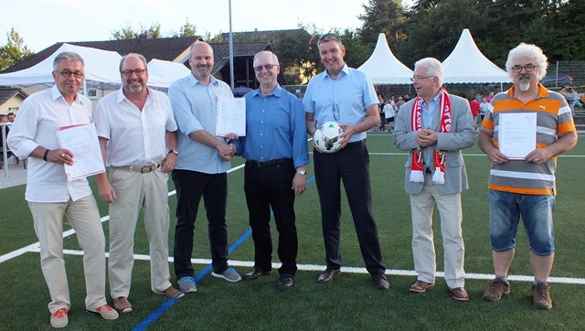 v.l. Gerd Darschin (1. Vors. TG Hallgarten), Richard E. Mayer (Ortsvorsteher Hallgarten), Christian Rau (1. Vors. SV Hallgarten, Manfred Schmidt (Vorsitzender Sportkreis Rheingau-Taunus), Michael Heil (Bürgermeister), Roland Laube (Stadtverordnetenvorsteher), Werner Schneider (Sportfreunde Hallgarten) Foto: Jürgen Glensk