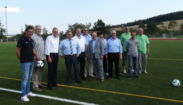 v.l. Stefan Krämer (Vorsitzender TuS Rückershausen), Kurt Kettenbach (Vors. Rot-Weiß Kettenbach), Peter Beuth (Innenminister- und Sport), Klaus-Peter Willsch (MdB), Udo Scheliga (Bürgermeister Aarbergen), Dirk Schmidt (Ortsvorsteher), Burkhard Albers (Landrat), Manfred Schmidt (Vors. Sportkreis Rheingau-Taunus), André Zorn (Gemeinde Aarbergen), Armin Plohmann (Vors. TV Michelbach), Thorsten Schneeweiß (Vors. BSC Michelbach), A. Atzbacher (TV Michelbach). Foto: Karl Heinz Stahl