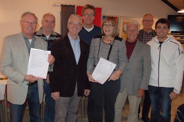 Der Sportkreisvorsitzende Manfred Schmidt (3.v.l.) und sein Vorstandskollege Helmut Heisen (3.v.r.) überreichten die Bescheide an (v.l.):Dr. Hermann Thieme, Dieter Rausch, Matthias Urban (alle TCH), Ute Lenk, Wolfgang Bremer (beide TV Wehen) und Erik Lang (TCH). Foto: MRM