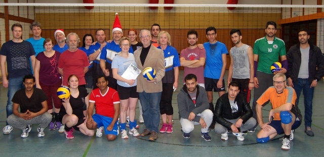 Rheingau-Taunus-Kreis/Hohenstein – (MRM) Überraschend schaute der Vorsitzende des Sportkreises Rheingau-Taunus Manfred Schmidt beim 22. Nikolaus-Schleifchen-Turnier der Volleyballgruppe des TuS Breithardt vorbei. In dieser Gruppe sind seit Längerem zahlreiche Flüchtlinge aktiv.