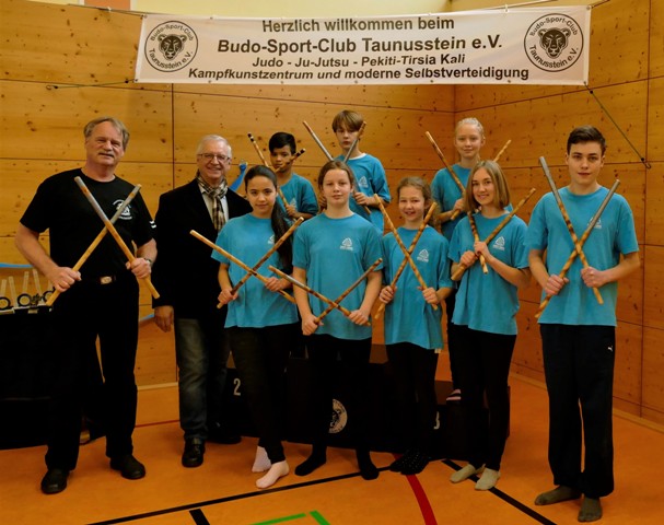 Vor der Verleihung der Urkunden für die U9 Kämpfer zeigten die jüngsten Mitglieder der Pekiti-Tirisa Kali Abteilung des Budo-Sport-Clubs ihr seit der Gründung der Trainingseinheit, im Mai 2016, erworbenes Können mit Stock-Drills, Sicherung eines angreifenden Armes bis hin zu sogenannten Take-Downs und demonstrierten somit das sehr komplexe System dieser philippinischen Kampfkunst.