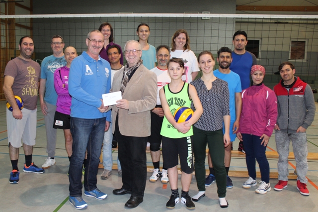 Der Vorsitzende des Sportkreises Rheingau-Taunus Manfred Schmidt und seine Jugendwartin Lena Herke schauten beim Training der Volleyballgruppe der Turngemeinde Winkel vorbei, die zahlreiche Flüchtlinge in das Team integriert haben. Bei dieser Gelegenheit überreichten sie dem Vorsitzenden der TG Winkel Klaus Seifert eine Zuwendung für die weitere Arbeit mit Flüchtlingen im Verein.
