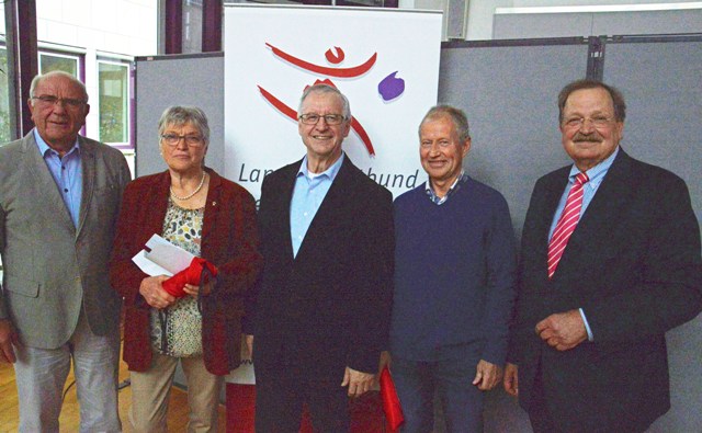 Ingrid Schäfer (2. von links) absolvierte zum 60. Mal das Deutsche Sportabzeichen, Armin Gossel (2. von rechts) zum 50. Mal. Für die herausragende Leistung wurden sie vom Deutschen Olympischen Sportbund mit einer Ehrenurkunde ausgezeichnet, die Sportabzeichen-Obmann Walter Fischer (links), der Vorsitzende des Sportkreises, Manfred Schmidt, und der Kreisbeigeordnete Günter F. Döring überreichten. Foto: Dr. Christoph Zehler