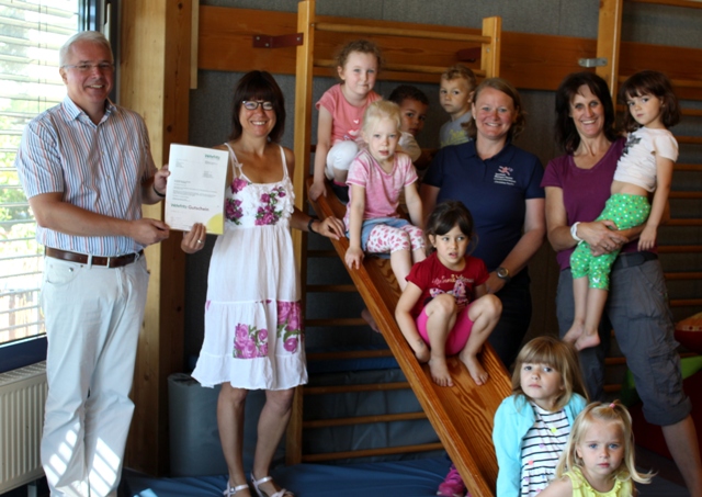 Sport und Bewegung sind ein wichtiger Bestandteil für die ganzheitliche Entwicklung von Kindern. Deshalb der Sportkreis Rheingau-Taunus e.V. bereits vor einigen Jahren die Aktion „Bewegen macht Spaß“ ins Leben gerufen. Dabei werden aktive Kindergärten und Kindertagesstätten, in welchen die Bewegung wichtiger Bestandteil der täglichen pädagogischen Arbeit ist, ausgezeichnet. Im Rahmen dieser Aktion besuchte Christina Fuchs vom Sportkreis Rheingau-Taunus e.V. bereits zum dritten Mal in Folge die Kindertagesstätte „Rabanus Maurus“ in Winkel. Gemeinsam mit der Leiterin Frau Marion Kupper sowie dem Kita-Koordinator für die Pfarrei St. Peter und Paul Rheingau, Herrn Stefan Eckert konnte sie sich im Bewegungsraum der Einrichtung von der Bewegungsfreudigkeit der Kindern, der Sonnenstrahlengruppe und ihrer Erzieherin, Frau Nicole Berg, überzeugen. Da alle Kriterien der Aktion erfüllt sind, freute sich Christina Fuchs, einen Wertgutschein für den Erwerb sportlicher Kleingeräte an Frau Kupper überreichen zu dürfen.