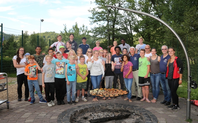 Gemeinsam zogen sie nach einem Erkundungsspiel des Camps auch schon in die im Wald gelegenen Stelzenhäuser ein und gingen abends auf die Suche nach dem Edersee. Leider mussten wir feststellen, dass vom See nicht mehr viel übrig war, da das Wasser für die Weserschifffahrt abgelassen wird. Was ein Glück hat das Camp aber einen Schwimmteich, der vom ersten Tag an auch täglich von unseren Teilnehmern genutzt wurde. Auch die zahlreichen Aktivitäten der nächsten Tage, wie Bogenschießen, Klettern, eine GPS-Tour, gemeinsames Grillen und Lagerfeuer Teamspiele und tägliches Beachvolleyball- und Fußballspiel, bei bestem Wetter, sorgten bei den Kindern und Jugendlichen der Partnersportkreise und den BetreuerInnen für ausgezeichnete Laune. Spielerisch lernten die Teilnehmer, im Team zusammenzuarbeiten, sich selbst zu organisieren und Entscheidungen zu treffen. Im Programmbaustein „Fit für die Vielfalt“ lernte die bunt gemischte Gruppe spielerisch, mit interkulturelle Gemeinsamkeiten und Unterschiede umzugehen, sowie ein soziales Miteinander im und durch den Sport.