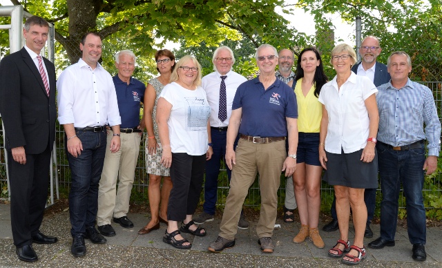 Die Verantwortlichen stellten anlässlich der Auftaktveranstaltung zum Gruppenbild (v.l.): Frank Kilian (Landrat), Holger Kilb (Schulleiter), Helmut Heisen (stv. Sportkreisvors.), Christine Zuther (stv. Schulleiterin), Ursula Molzahn (2. Vorsitzende TSV), Prof. Dr. Heinz Zielinski (Vizepräsident lsb h), Manfred Schmidt (Sportkreisvors.), Tobias Rheinberger, Monika Sauck (beide ÜL), Prof. Dr. Regina Stratmann-Albert (TSV-Vorsitzende), Manfred Kohl (BM von Walluf) und Dr. Frank Obst (lsb h). Foto: MRM