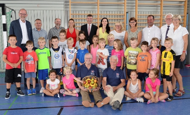 Die Verantwortlichen vom Landessportbund sowie aus Politik, Schule und Verein (hinten) stellten sich zusammen mit den Kindern sowie dem Sportkreisvorsitzenden Manfred Schmidt (sitzend l.) und seinem Stellvertreter Helmut Heisen) zum Gruppenbild. Foto: MRM